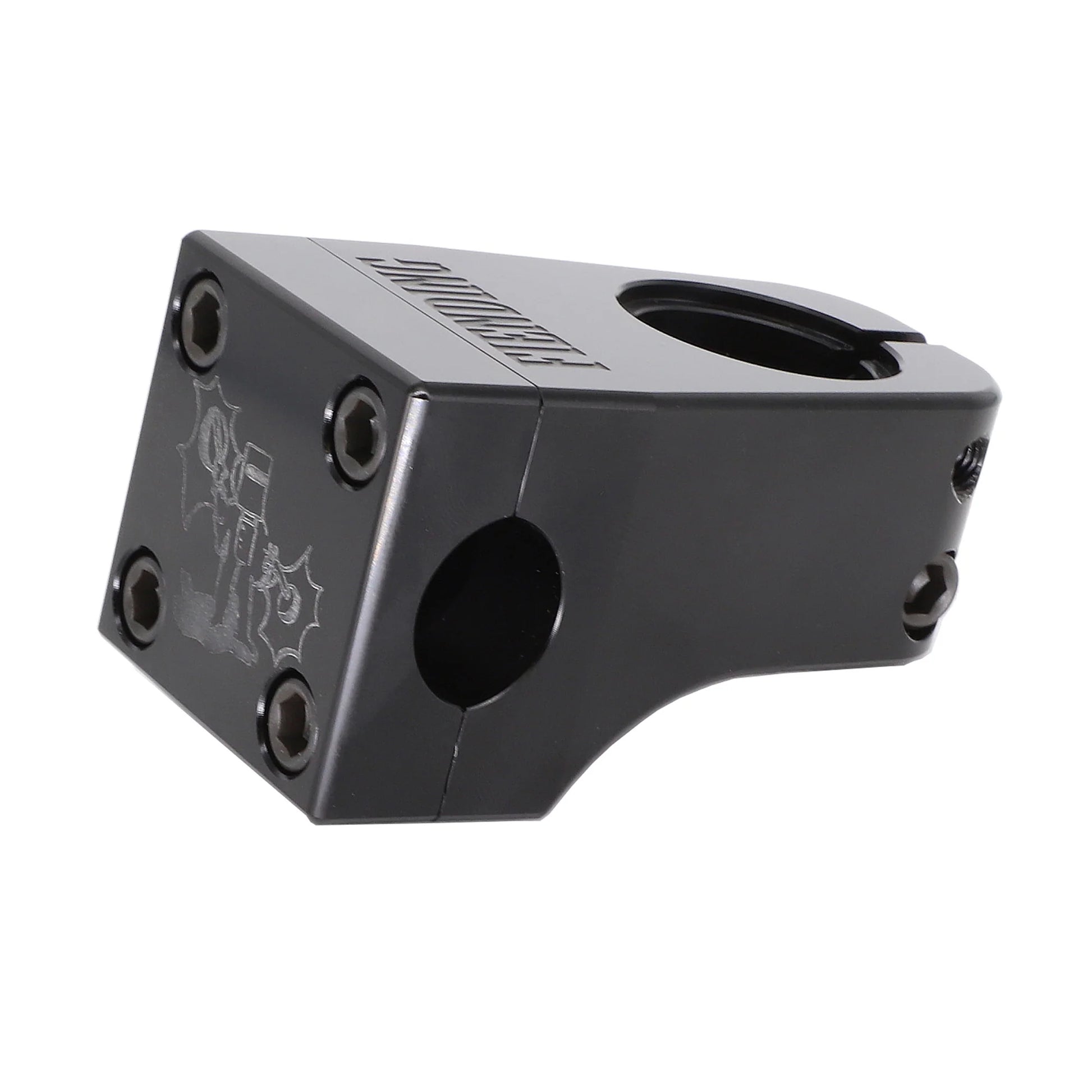 The Mills stem is CNC'ed from 6061 aluminum with a retro look and 50mm reach with a wide body for added clamping power. Featuring an internally machined stem body and full internal bar surface contact body and front cap for improved bar grip, a 10mm rise, a recessed fork bolt area for a clean look, solid chromoly stem bolts for strength and a CNC'ed Fiending logo. Weight: 11.7ozs.