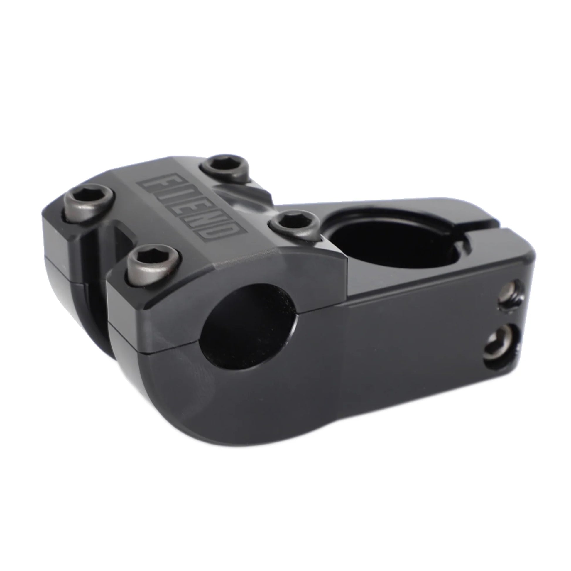 The Ransom stem is CNC'ed from 6061 aluminum with a 50mm reach with a wide body for added clamping power. Featuring an externally machined stem body and full internal bar surface contact body and front cap for improved bar grip, a 26mm rise, a recessed fork bolt area for a clean look, solid chromoly stem bolts for strength and an etched Fiend logo. Weight: 11.8ozs.