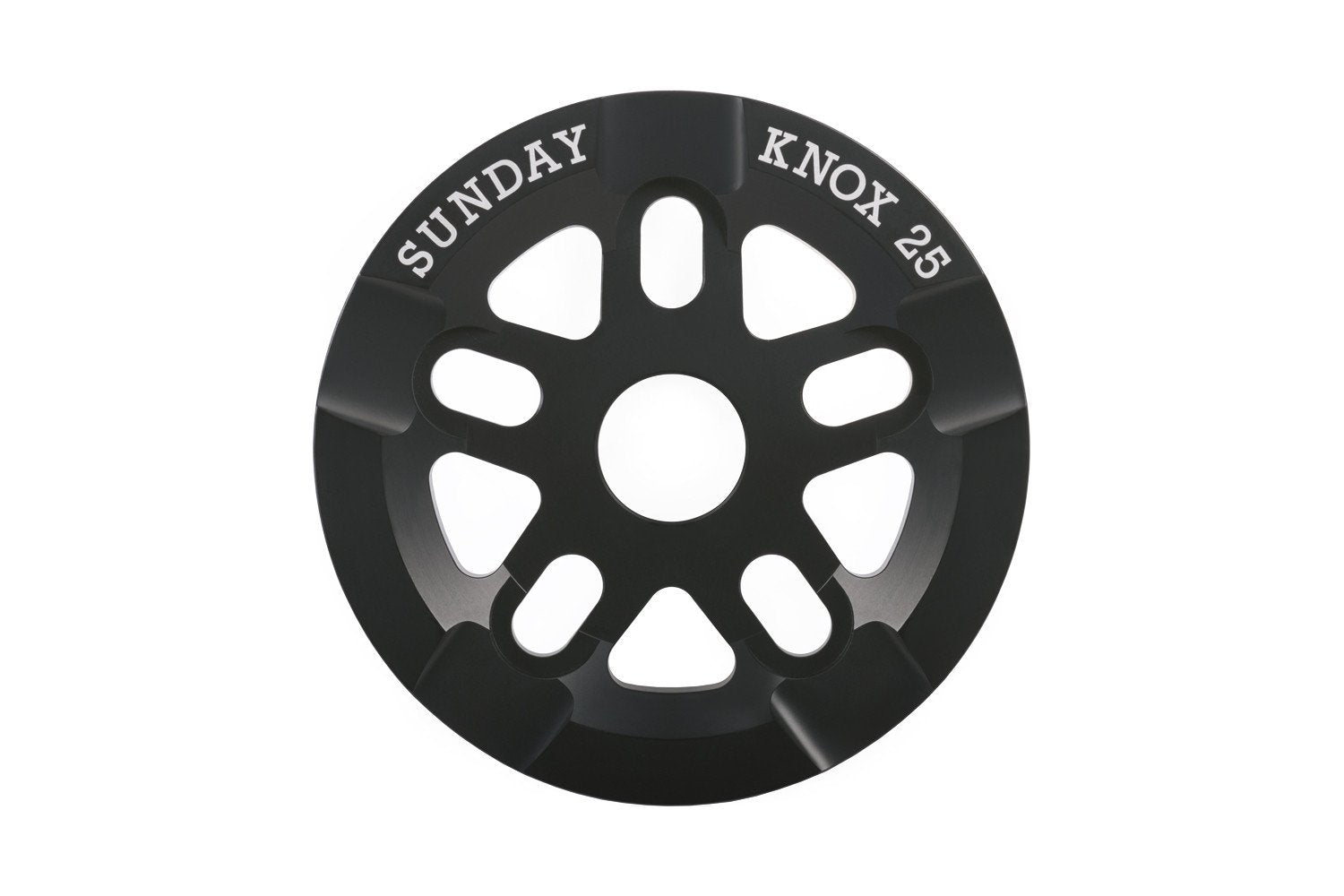 Most of the Sunday team has been riding guard sprockets for a long time, so it was just a matter of time before we did our own. The Knox sprocket is made of 7075 aluminum and comes with a full guard on 1 side of the sprocket. Even more important is the fact that it’s designed to fit larger chains like half-link chains. It’s made super strong and will help you protect your chain from being hit when slipping off a rail or messing up on a crankslide.