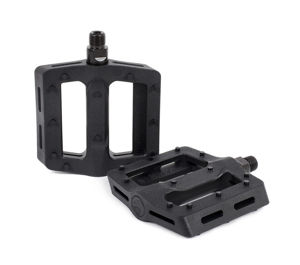 The pedal is a key contact point between you and your bike, so we made the new Shadow Surface Pedal with performance and function in mind. We started with a wider and longer, slim platform. The wide 105mm x100mm platform is specifically shaped to be thin and stiff while still offering an overall concave shape. We added advanced micro knurling and 12 pins per side for a maximum grip that still allows foot adjustments mid-shred. Made with the same proven nylon composite material as the Ravager pedal, with a heat treated chromoly axle that includes a 6mm broach for ease of installation and high end looks.